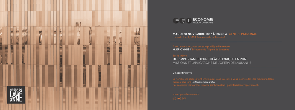 Nous vous informons que la prochaine Conférence d’automne se déroulera le 28 novembre 2017 à 17h30 au Centre Patronal. Nous aurons l’honneur d’entendre M. Eric Vigié, Directeur de l’Opéra de Lausanne.